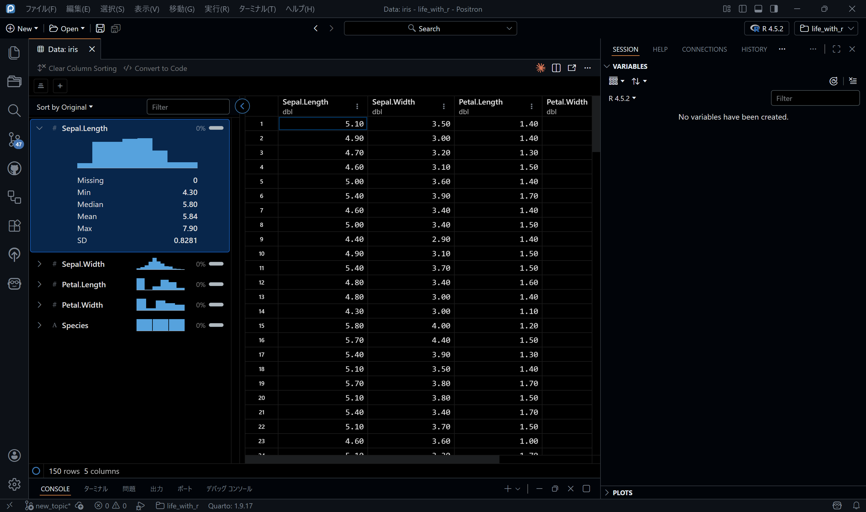Positronの場合は、画面右側にVARIABLESペインがあり、そこにデータが表示されるので、見たいデータをダブルクリックすれば同様に確認できます。Positronの場合は平均値や欠損数も表示されるので便利だと思います。
