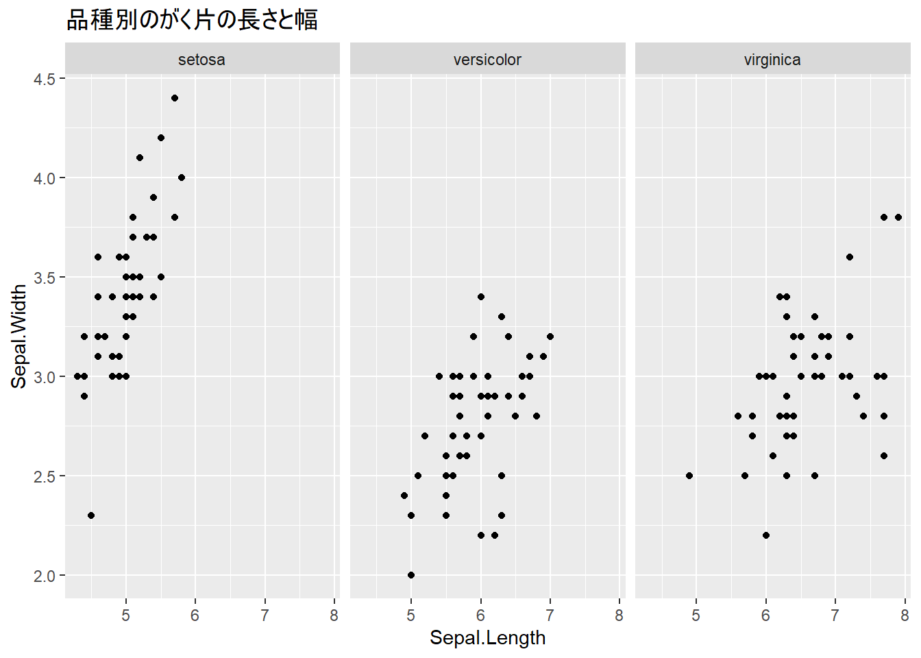 labs(title = "品種別のがく片の長さと幅")