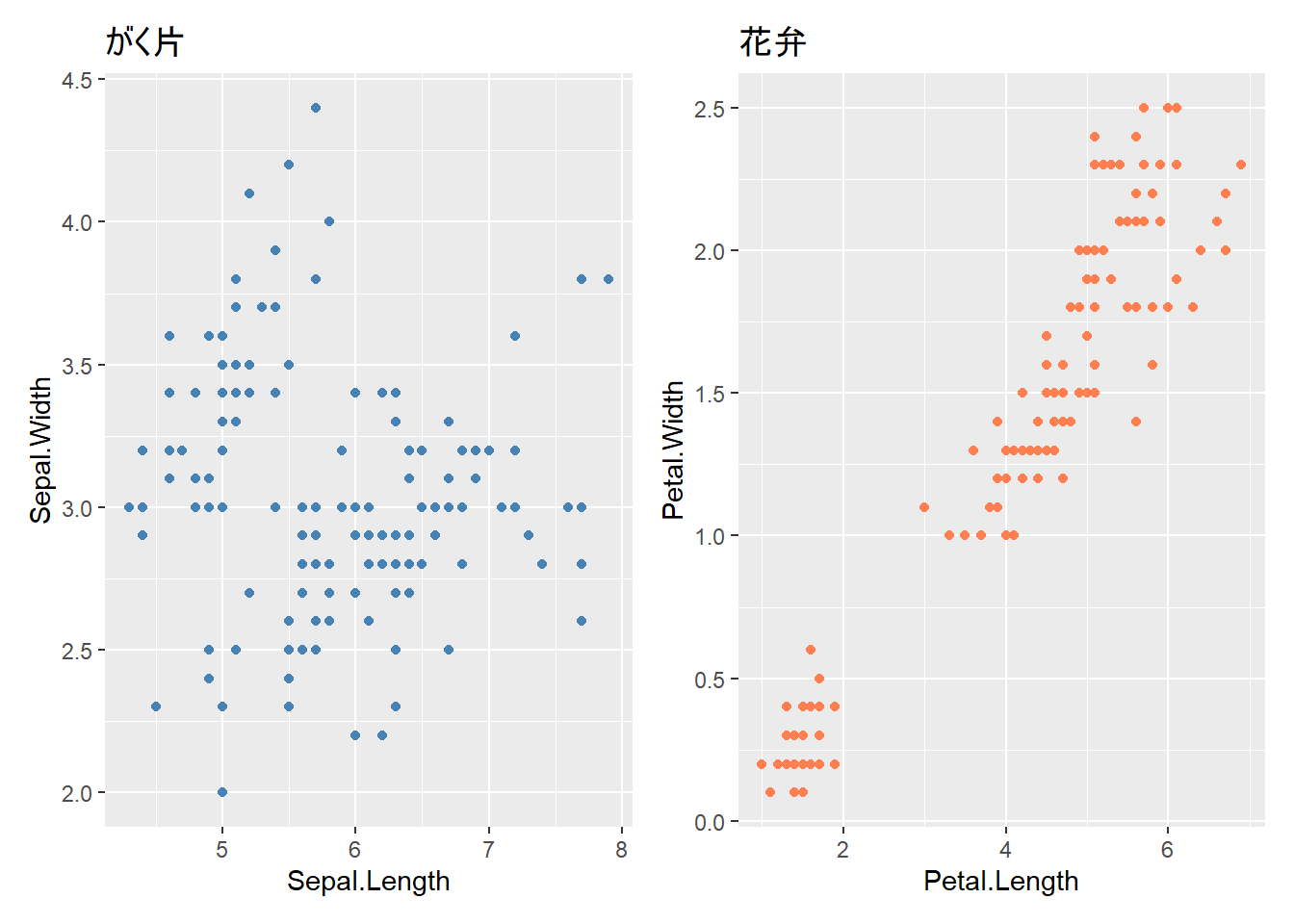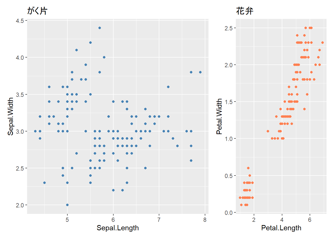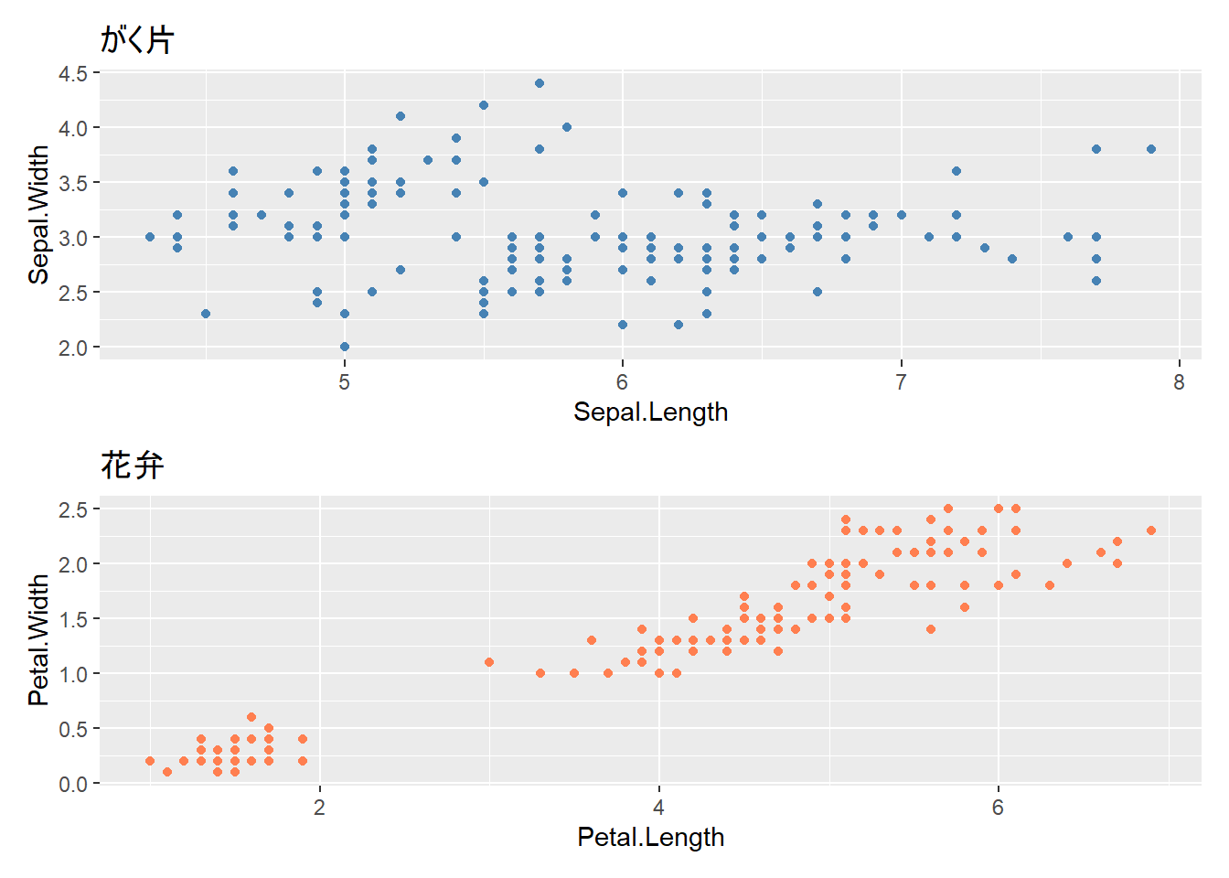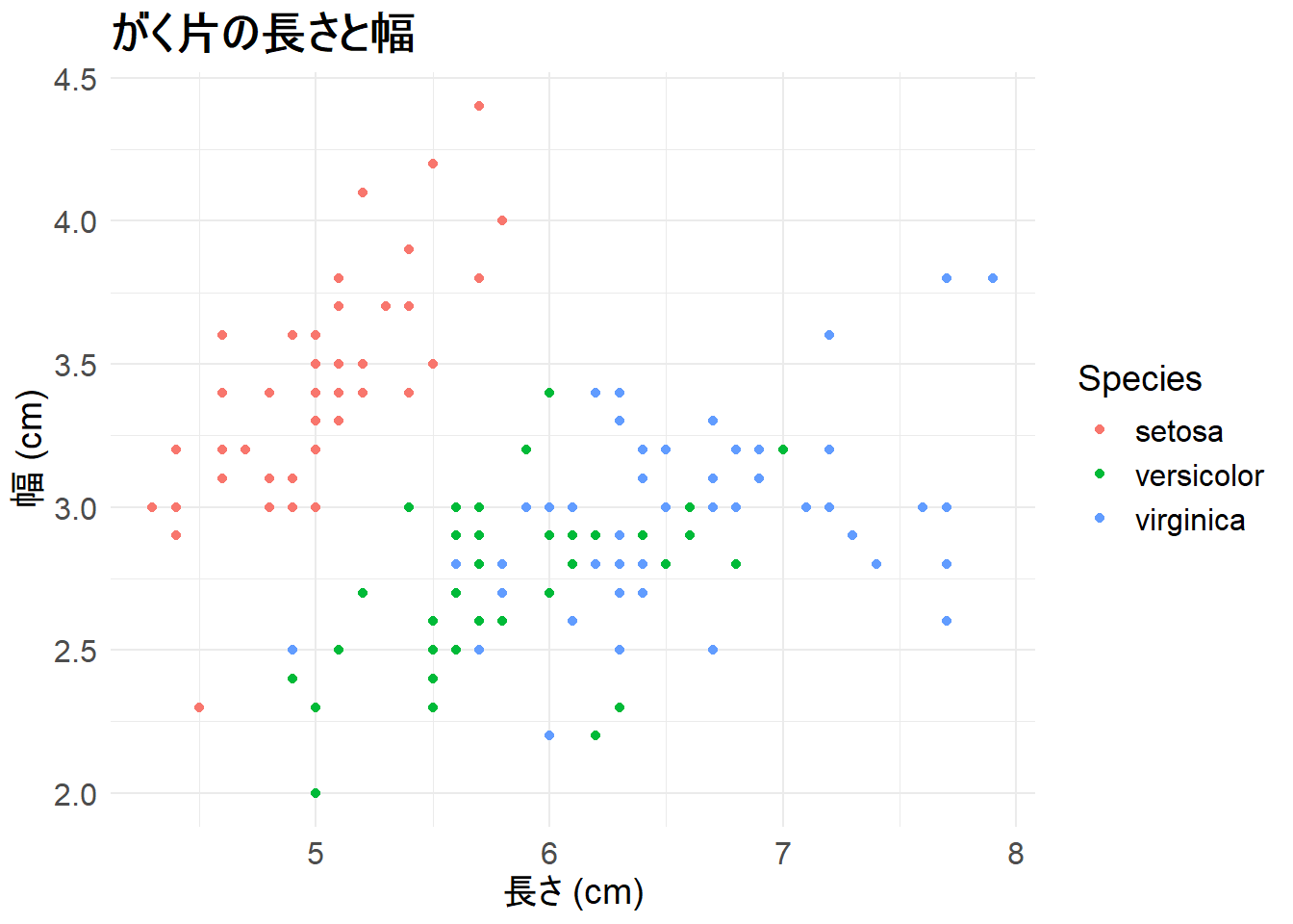 labs(title = "がく片の長さと幅", x = "長さ (cm)", y = "幅 (cm)") +