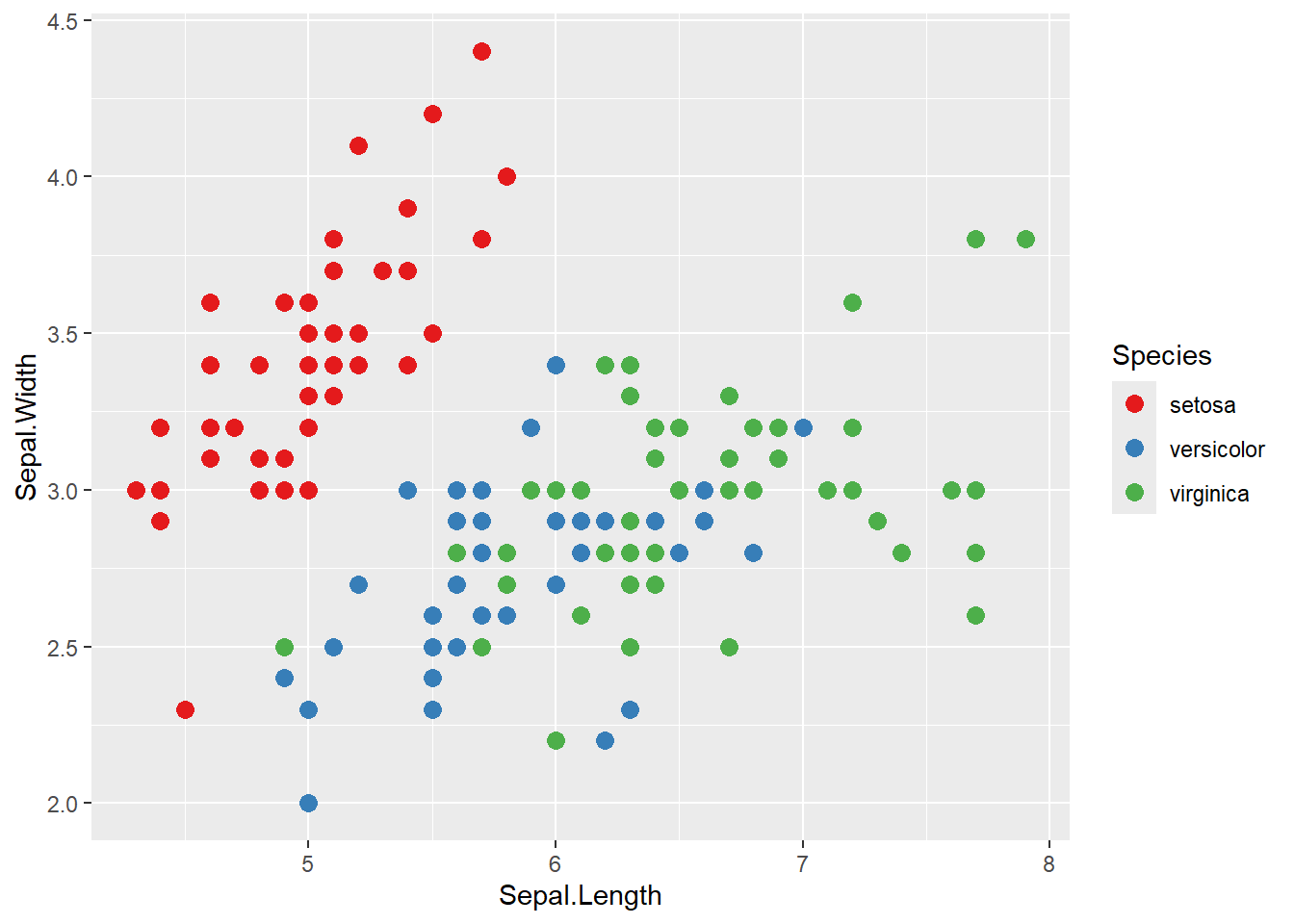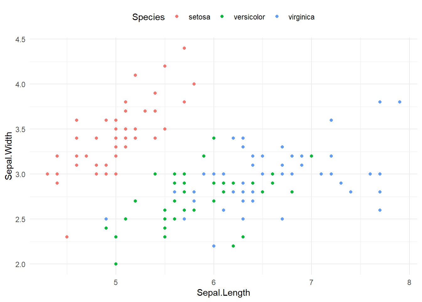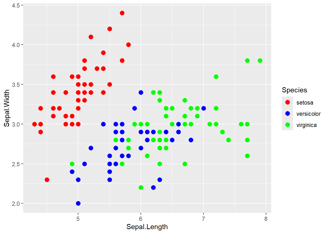 ggplot(iris, aes(x = Sepal.Length, y = Sepal.Width, color = Species)) +