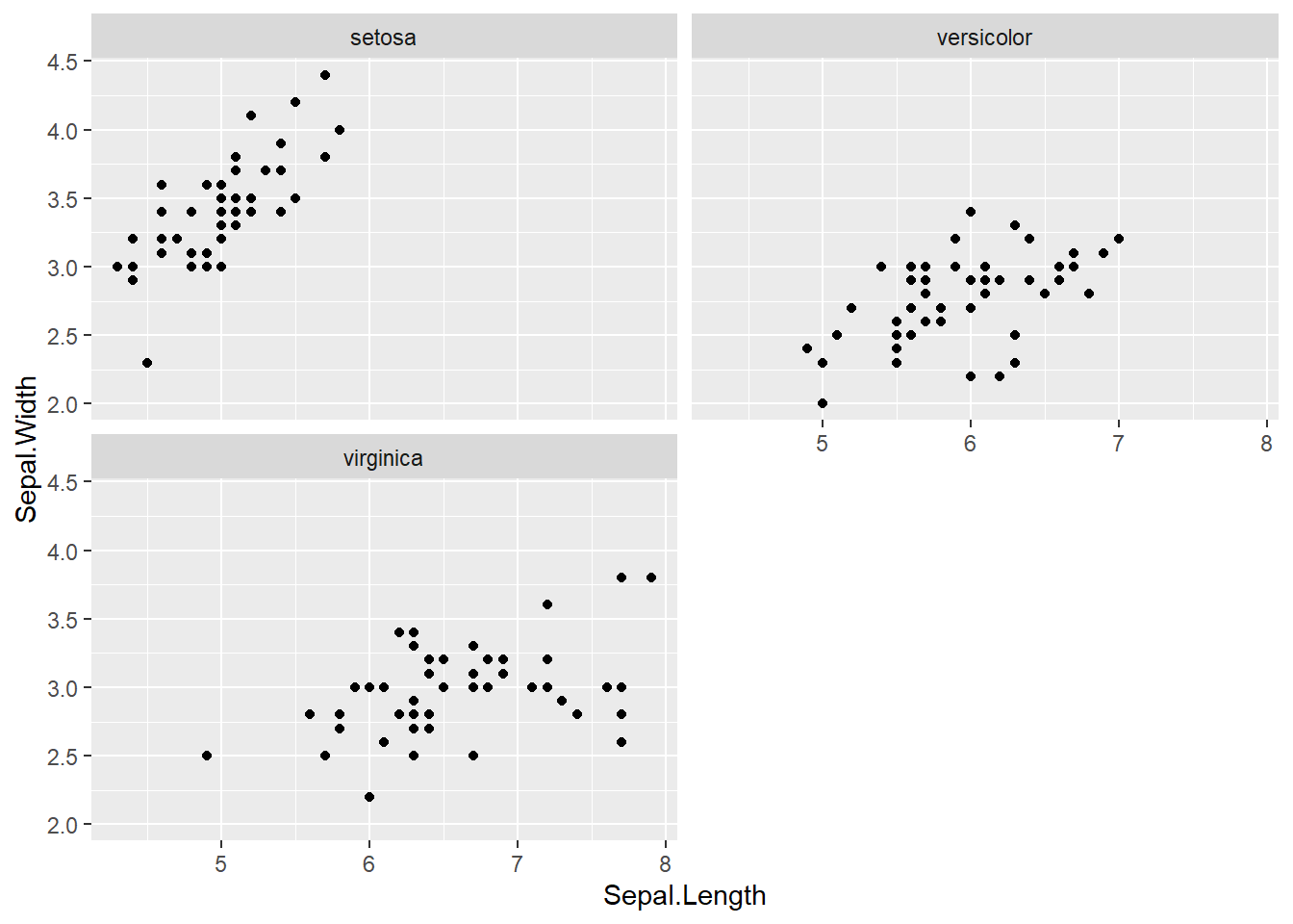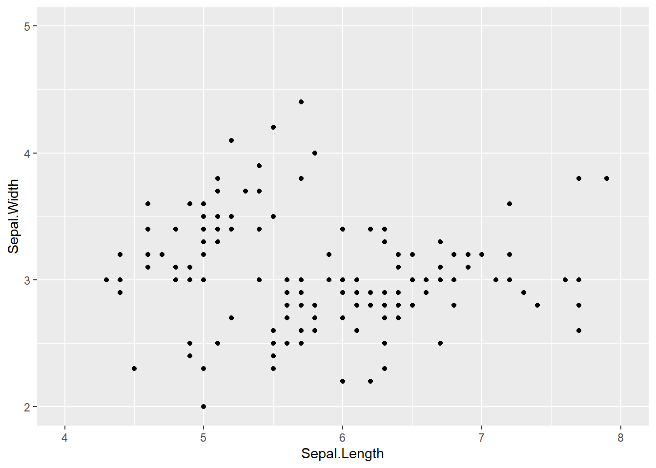 ggplot(iris, aes(x = Sepal.Length, y = Sepal.Width)) +