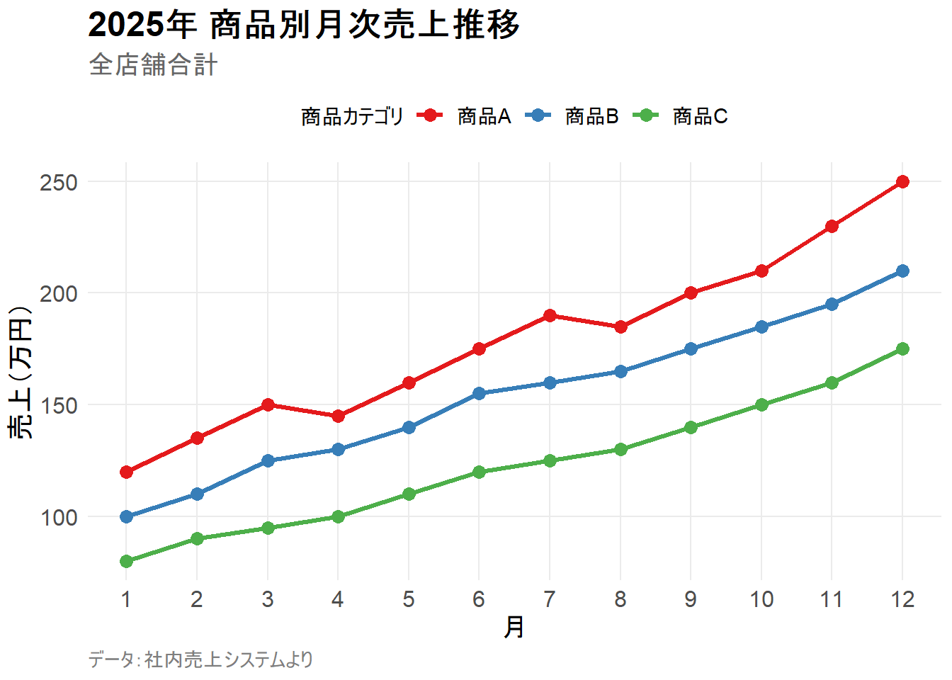title = "2025年 商品別月次売上推移",