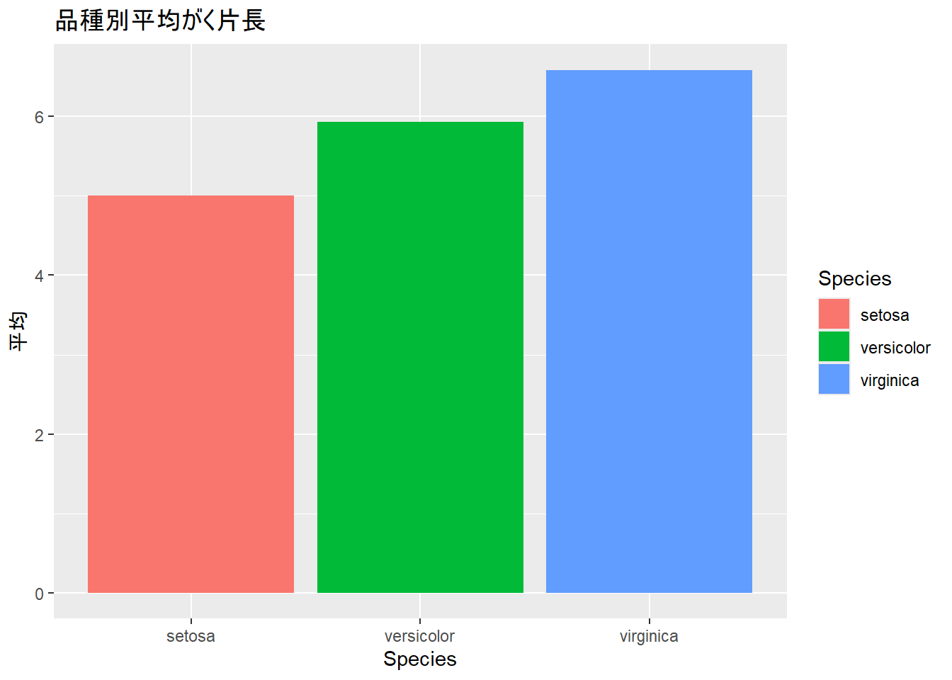 ggplot(iris_summary, aes(x = Species, y = 平均, fill = Species)) +